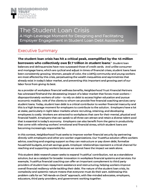 TrustPlus clients inform “Insurance Alone is Not Enough,” new research and insights from Neighborhood Trust Financial Partners and RIP Medical Debt which find employee medical debt and confusion around health insurance is a growing problem for employers. Nearly half of workers with employer provided health insurance reported struggling to understand their coverage. Over 60% reported struggling to afford prescription medications. Financial stress plus health-related stress plus confusion over coverage and costs equals bad news for mental health, productivity, and wellness, and for your bottom line or social impact. Personal Financial Coaching can help. A service of Neighborhood Trust Financial Partners, TrustPlus helps employees maximize their health benefits while reducing, eliminating, or avoiding medical debt in the first place—which is good news for your employees and your organization. Read the full report including four recommendations for employers to prevent medical debt and its negative impacts on your organization and workers.